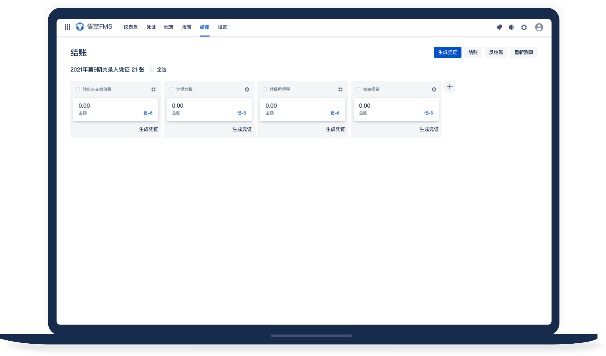 在悟空財務(wù)管理系統(tǒng)中內(nèi)置各種模板,在期末結(jié)賬中,您可以根據(jù)實際情況有選擇的生成期末憑證。
